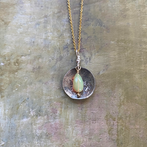 An oxidized*, silver dusted sphere, made into a shallow bowl, cradles a couple of Labradorite gemstones and strung on a 14k gold fill** headpin. Strung on an 18" of Delicate 14k gold fill chain and finished with an oxidized sterling silver lobster clasp.